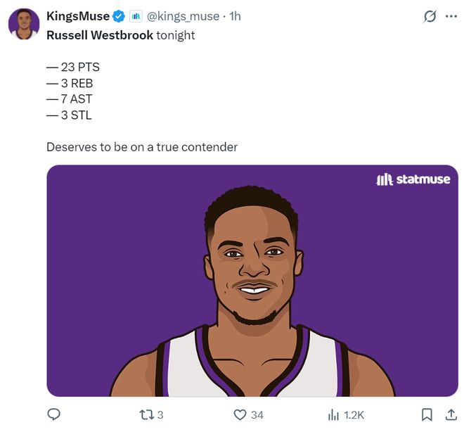 他写道:威少的表现真的太出色了,他拿着最低的工资单每晚都全力以赴,他的助攻、篮板、得分在国王都名列前茅,助攻还是联盟前五的水准,我们应该看看交易截止日进入最后两周,他能不能转投到一些有争冠竞争力的球队。