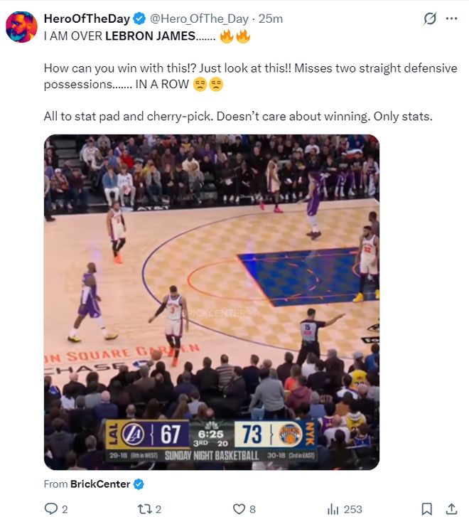 著名詹黑媒体赛后吐槽勒布朗的防守(正好就是湖人第三节崩盘的开始):我对勒布朗-詹姆斯已经厌倦了,他这样打球怎么可能赢?看看这个瞬间吧,连续两个防守回合都漏人,他只顾着刷数据、挑有利数据的位置,他根本不在乎输赢,只在乎数据。