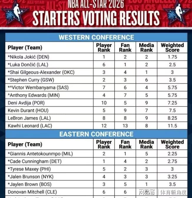 新科MVP兼FMVP亚历山大(这位可是来自枫叶之国加拿大的猛将)因为腹部拉伤,今年全明星赛只能干瞪眼没法上场咯,世界队这下可算是折了一员超级大将。就说2026年全明星投票那阵儿,亚历山大在球迷投票里排第四,球员投票西部第三(也就比约基奇和库里差点儿意思),媒体投票那更是直接冲到第一,最后综合权重(权重为3)排西部第三。要是全明星赛少了亚历山大,可能还不至于让联盟“元气大伤”,可要是少了票王呢?