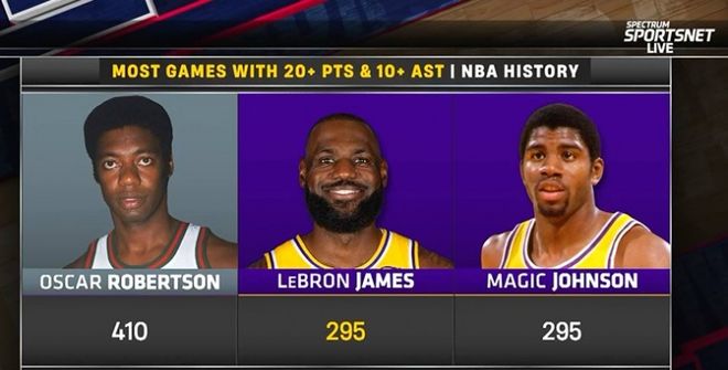 第五,这是詹姆斯湖人生涯第50次取得三双。湖人队史仅2人取得过50+次三双:分别是魔术师-约翰逊的138次和詹姆斯的50次。