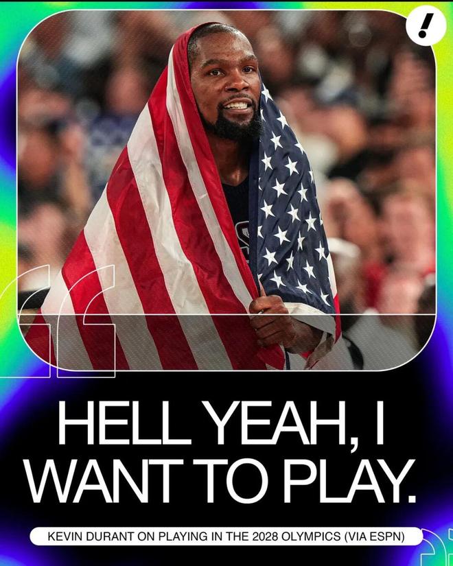 值得一提的是,这其实不是杜兰特第一次表达愿意参加2028年奥运会,此前在追梦格林的播客节目里,谈到是否会参加2028年奥运会,杜兰特也这么说过: