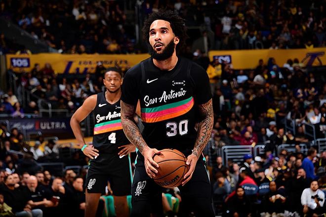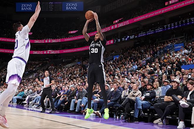 本场比赛中,马刺的先发锋线大将朱利安-尚帕尼(Julian Champagnie)的表现又一次令人刮目相看。尚帕尼全场出场36分26秒,投篮12中6,三分线外8中5,得到了17分6篮板1助攻1抢断2盖帽的数据,还有1次失误和3次犯规,正负值为+9。尚帕尼在进攻端的效率依然非常稳定,他也是将自己在外线投篮方面的表现完全发挥了出来,他也是抓住了不多的机会得到了不少分数,在进攻端为球队提供了不少的支持。尚帕尼在防守端的表现同样是可圈可点的,他也是将自己出色的个人防守能力完全发挥了出来。尚帕尼在本场比赛中可以说是展现出了优秀3D类型锋线球员的水准,在攻防两端都起到了关键的作用,这也为球队的胜利做出了巨大的贡献。