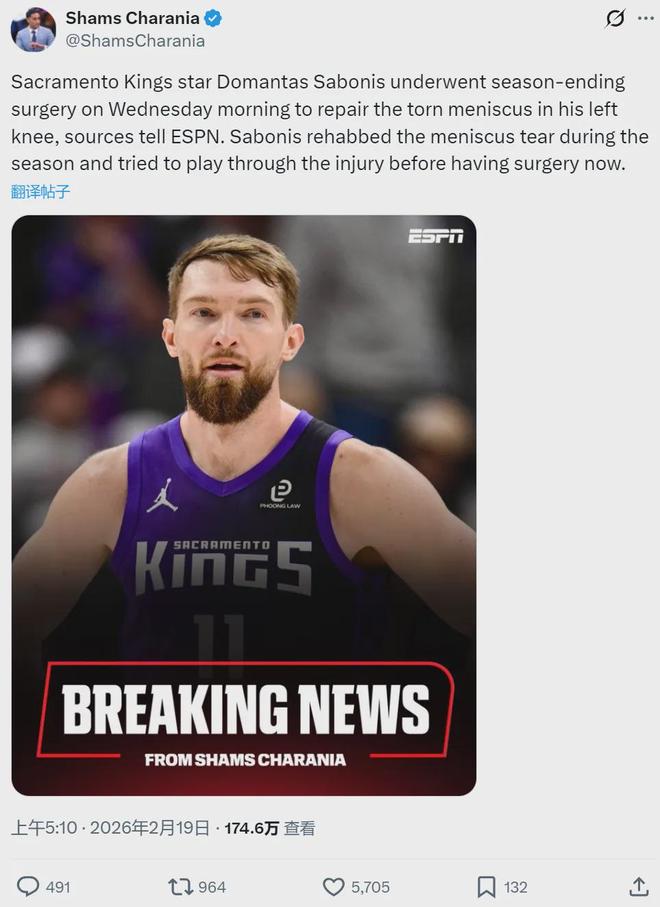 坏消息,国王队多曼塔斯·萨博尼斯接受膝盖手术,赛季报销