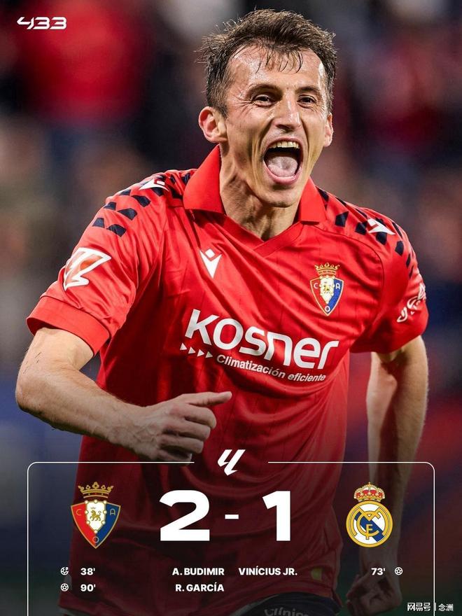 西甲第25轮,皇马客场1-2奥萨苏纳,联赛8连胜终结,先赛一场2分领跑。布迪米尔造点+点射,姆巴佩小角度破门但越位在先无效,巴尔韦德助攻维尼修斯扳平,劳尔-加西亚绝杀。