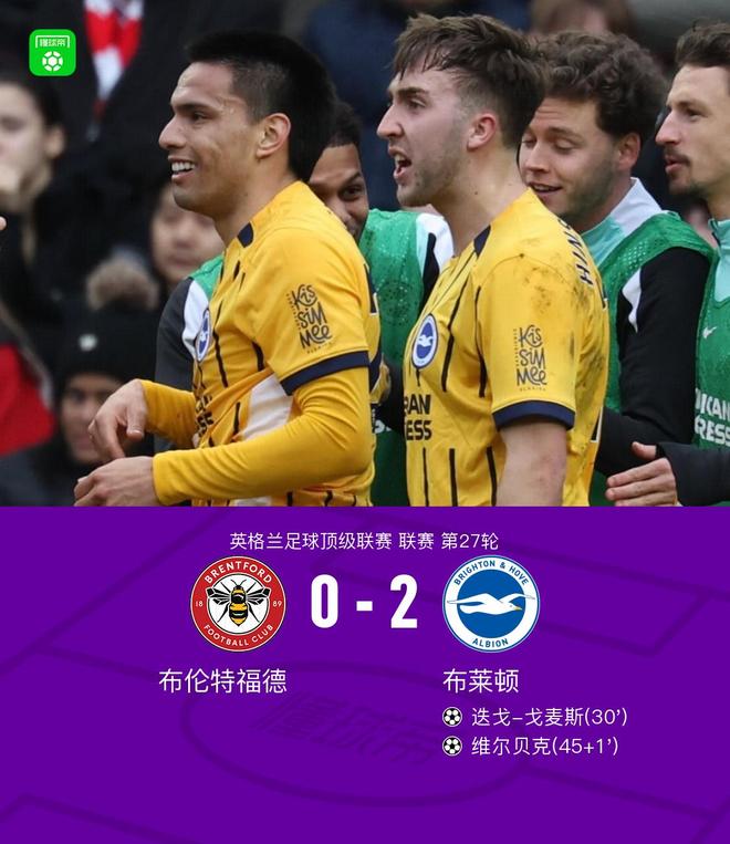 北京时间2月21日,英格兰足球顶级联赛第27轮,布伦特福德主场对阵布莱顿。比赛中,迭戈-戈麦斯、维尔贝克分别破门。最终,布伦特福德0-2不敌布莱顿。